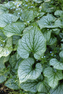 Brunnery lubię wyjątkowo – za piękne liście, niesamowicie lazurowe kwiaty i przede wszystkim za wytrzymałość i zdolność regeneracji oraz łatwość uprawy. Potrafią odrastać z najmniejszego nawet kawałka korzonka. Jedną z moich ulubionych odmian jest 'Jack Frost’, pieszczotliwie nazywany Jacusiem. Dlaczego piszę o nim w maju? Bo jest chyba najdłużej kwitnąca odmianą, pąki zaczęły się rozwijać po 10 kwietnia i wciąż jeszcze kwitnie. Do tego dochodzą niezwykle urokliwe, marmurkowe liście zdobiące roślinę do końca sezonu. Ta brunera jest wspaniałą roślina do cienia, jeśli odpowiednio dobierze się jej stanowisko to odwdzięczy się silnym wzrostem i obfitym kwitnieniem. Mój Jacuś rozrasta się jak szalony, wspaniale zdobi ogród. Najpiękniej wygląda w grupie kilku sztuk w towarzystwie host i pierwiosnków.