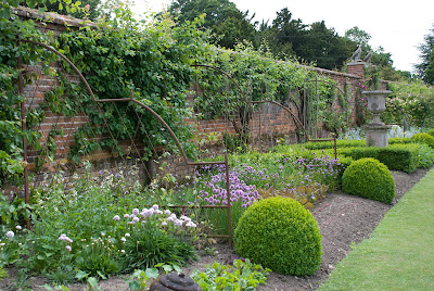 Część założeń ogrodowych liczy sobie kilka wieków, część jest znaczni9e nowsza i pochodzi z połowy XX wieku. Ogrody mają klasyczny charakter, rabaty otoczone są regularnie strzyżonymi żywopłotami (głownie bukszpanowymi) a całość ceglanym murem. Ciekawostką na pewno są klasyczne angielskie rabaty bylinowe połączone z ogrodem warzywnym. Jednak to co przyciąga turystów do tego ogrodu to głównie róże, znajduje się tam pokaźna kolekcja starych róż historycznych ale także można obejrzeć sporo róż nowoczesnych. Róże są wszędzie – na rabatach, murach, pergolach, altankach. W niezliczonej ilości form, kształtów i kolorów. Naszą uwagę zwróciły jeszcze fantastycznie prowadzone drzewa owocowe oraz całkiem sporo kolekcja piwonii i irysów. Zachwytom nad piwoniową rabatą nie było końca… Wzdłuż ciągnącego się jak nam się wydawało, w nieskończoność muru dumnie ku słońcu wychylały się główki najpiękniejszych odmian. Na pewno to było coś co warto zobaczyć.