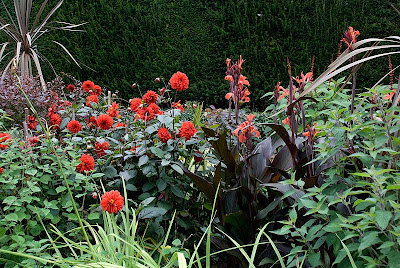 Na szczególną uwagę o tej porze roku zasługuje zdecydowanie Red Border– czerwona rabata, jedna z najbardziej znanych i opisywanych w książkach o kompozycji roślin. Dominowały tutaj dalie, róże, canny, świecznice, fuksje i liliowce, sporo szarłatów, trochę phormium i kordylin. Jako zielone przerywniki głównie miskanty chińskie ale także liście innych roślin. Oczywiście nie mogło zabraknąć krzewów: bzy czarne 'Black Lace’, purpurowe perukowce, leszczyny. Wiosną podobno króluje tutaj tulipan 'Queen of the Night’ (mój ulubiony). Tłem oczywiście jest idealnie przycięty żywopłot i trawnik.