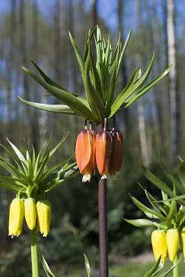 Kwitną też szachownice cesarskie nazywane cesarską koroną, Fritillaria imperialis. Ta szachownica wydziela specyficzny zapach (zarówno cebula jak i sama roślina podczas wegetacji), nie wszyscy go lubią. Mnie on nie przeszkadza. Za to zdecydowanie przeszkadza nornicom, raczej jej nie tkną.